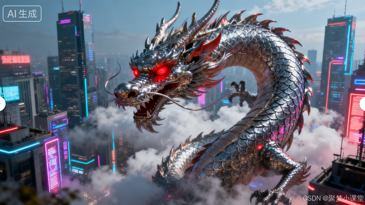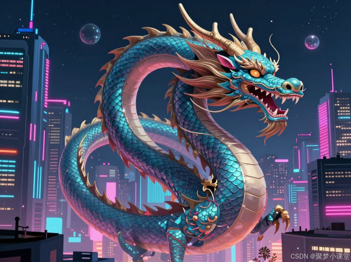提示词: 一条东方巨龙盘旋在现代化的都市上空,赛博朋克风格,霓虹灯光,细节丰富的插画风格。