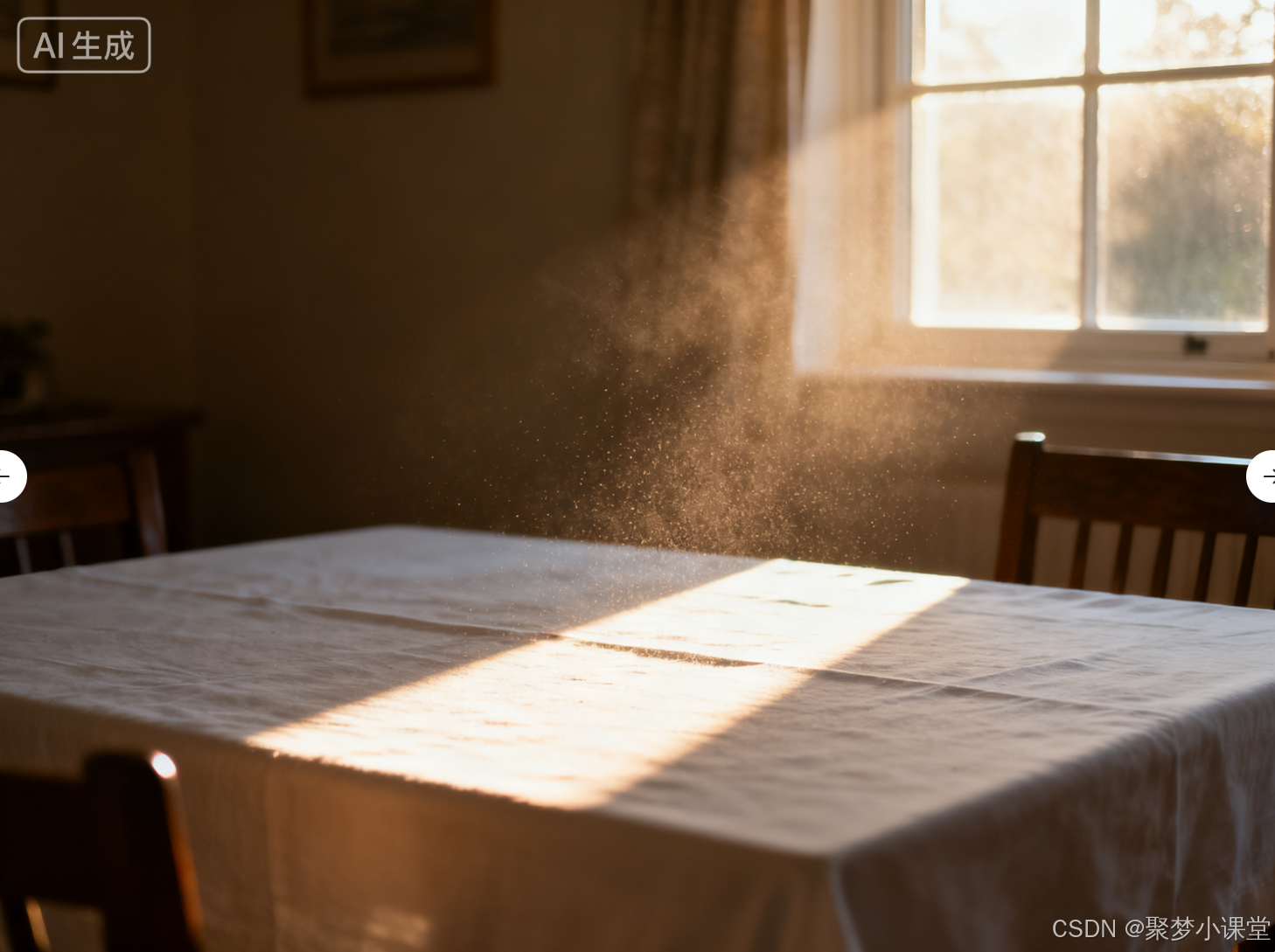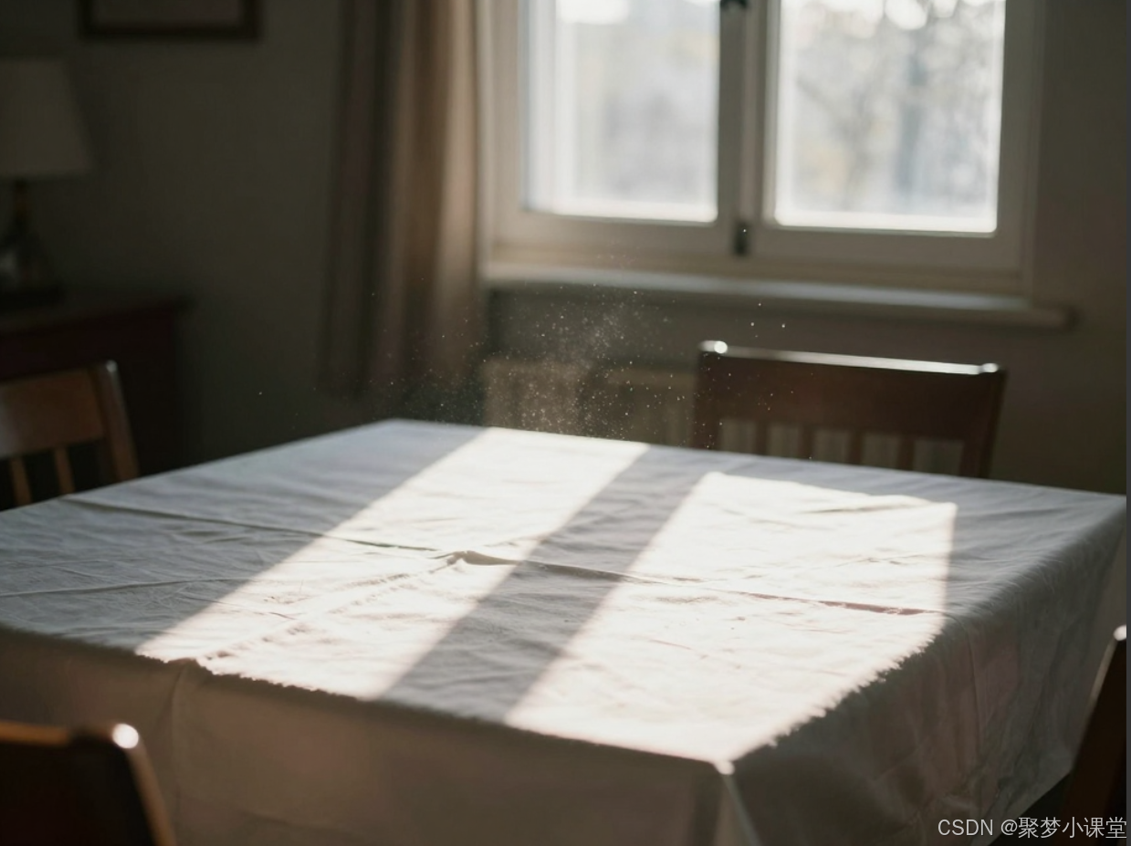 提示词: 清晨的阳光从窗户斜射进房间,在铺有白色桌布的餐桌上形成一道光斑,空气中能看到尘埃。逆光摄影。