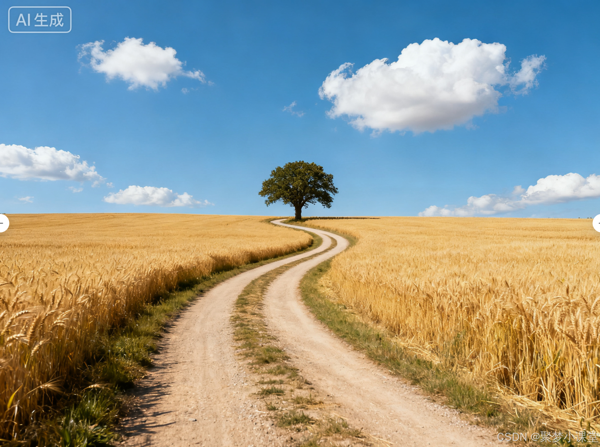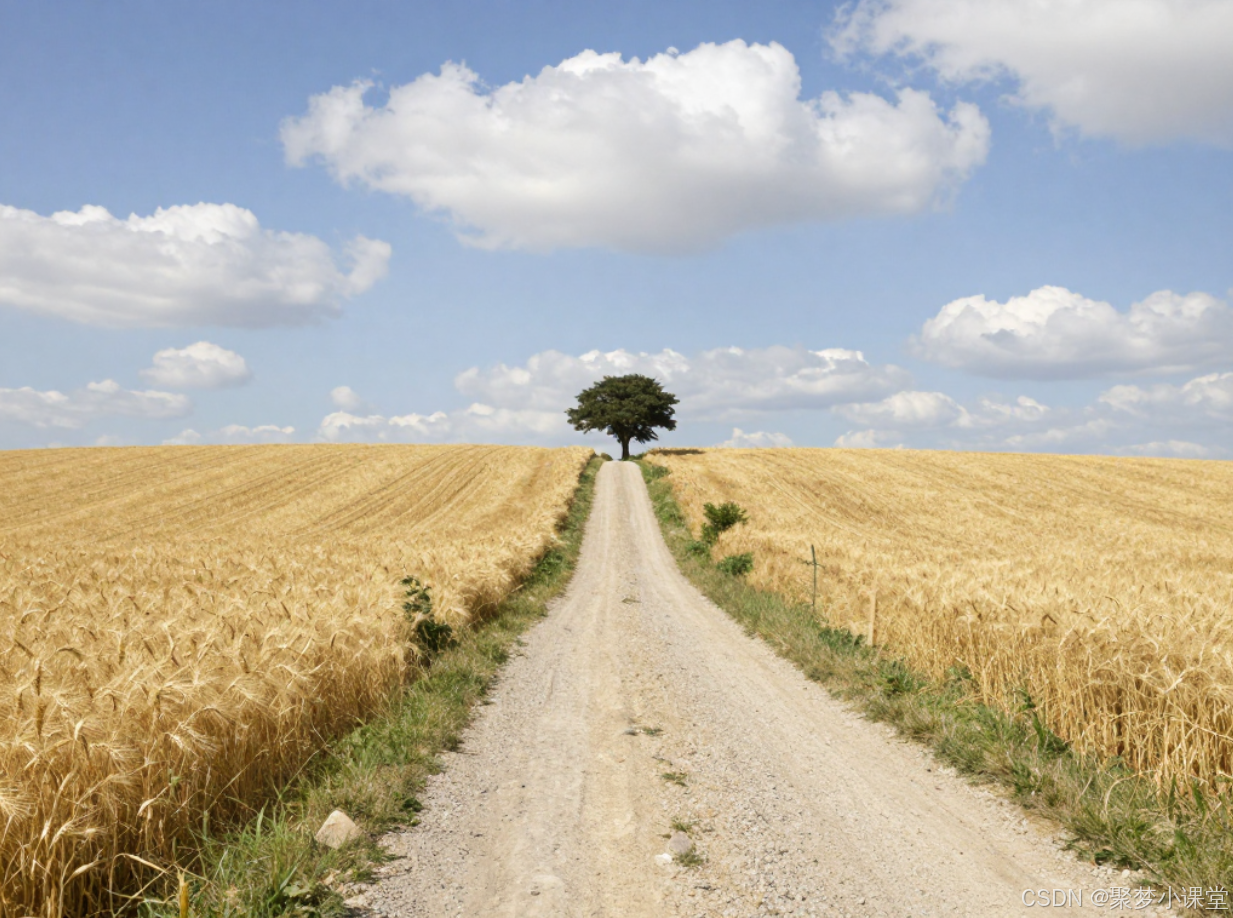 提示词: 一条蜿蜒的乡村小路穿过金黄的麦田,通向远处的一棵孤树,天空中有几朵白云。广角镜头。