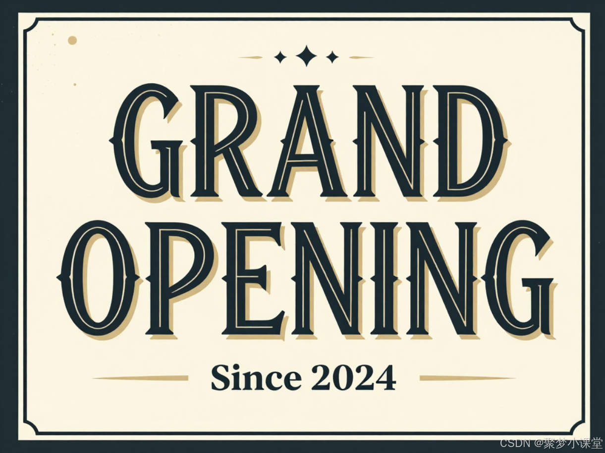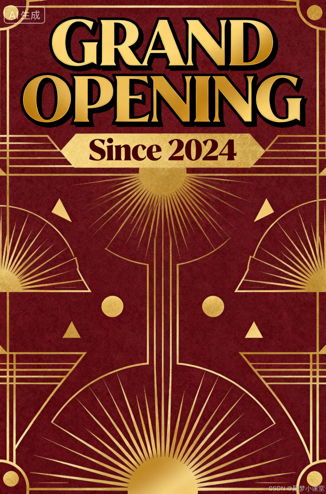 提示词: 一张复古风格的海报,标题是“GRAND OPENING”,采用装饰艺术字体,下方有较小的副标题“Since 2024”。