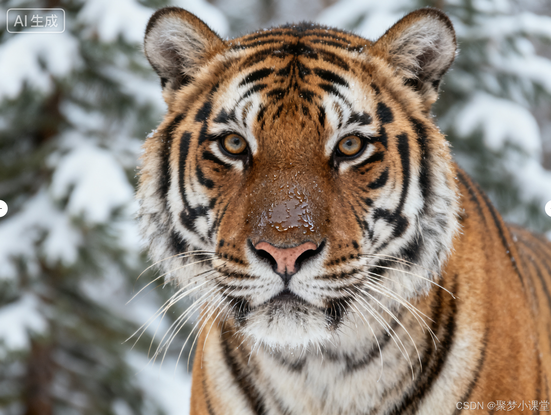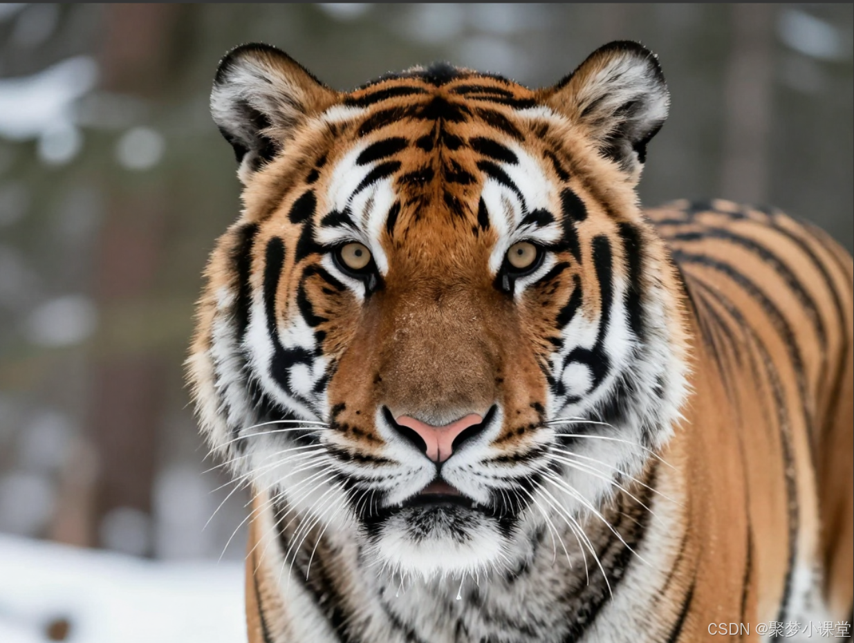 提示词: 一只西伯利亚虎的正面肖像,目光炯炯有神,湿漉漉的鼻头,胡须根根分明,毛发纹理清晰,背景是虚化的雪松林。
