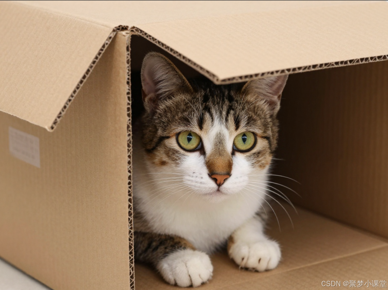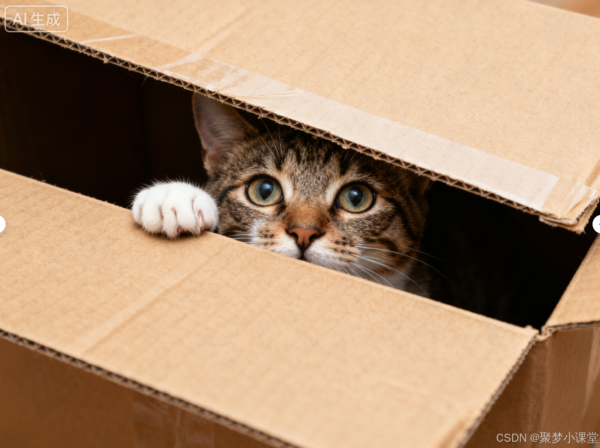 提示词: 一只猫正从一個半开的纸箱里探出头来,好奇地张望。纸箱的 flaps 部分遮挡了猫的脸部和前爪。