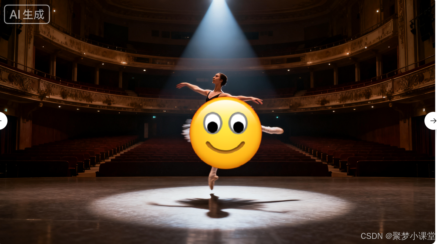 提示词: 一位芭蕾舞者在空旷的剧院中央跳跃,动作舒展,聚光灯打在她身上, Motion blur(运动模糊)捕捉裙摆的舞动。