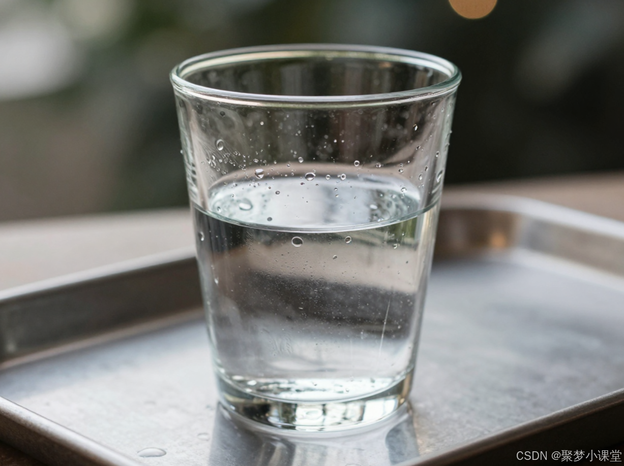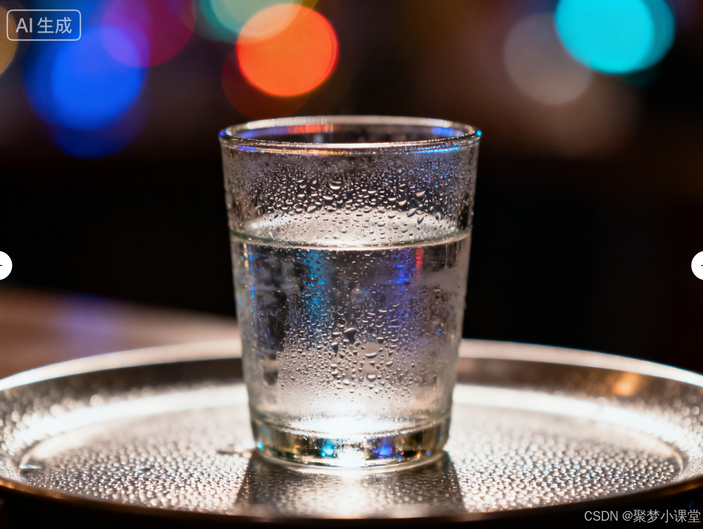 提示词: 一个装着半杯水的玻璃杯,杯壁上有冷凝水珠,放在一个磨砂金属托盘上,背景有焦外光斑。