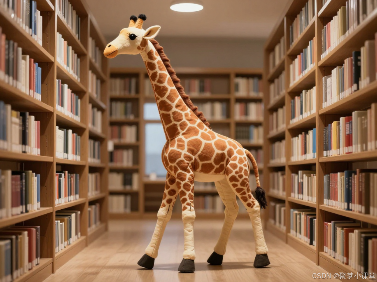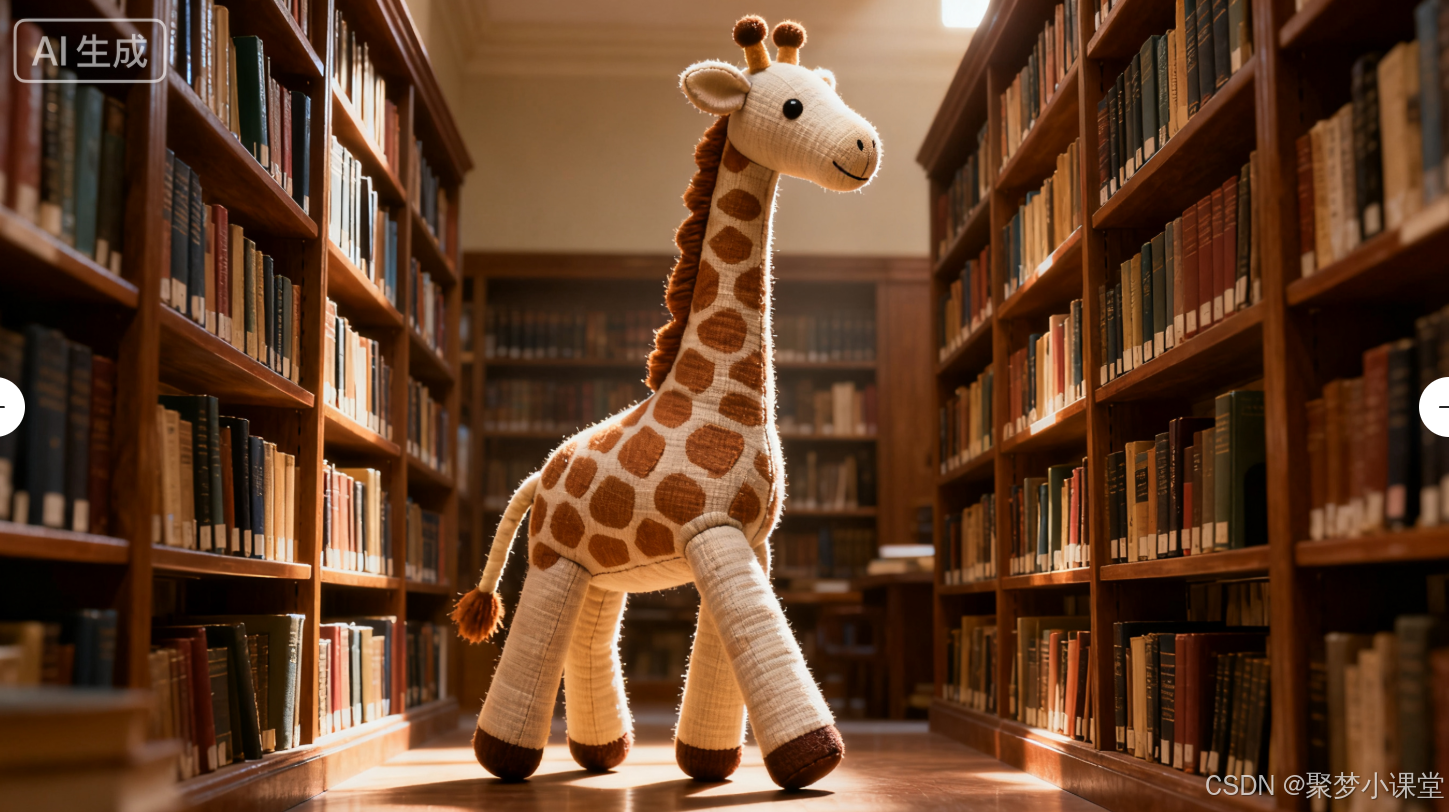 提示词: 一头巨大的布质长颈鹿玩偶,在图书馆的书架之间漫步,概念艺术,柔和的顶光。