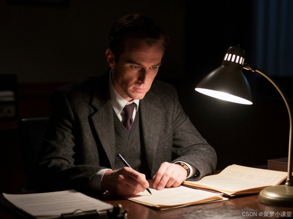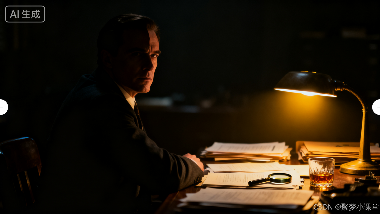 提示词: 一个侦探在昏暗的办公室里,只有台灯照亮他半边脸和桌上的档案,强烈的 chiaroscuro(明暗对比)效果,黑色电影风格。