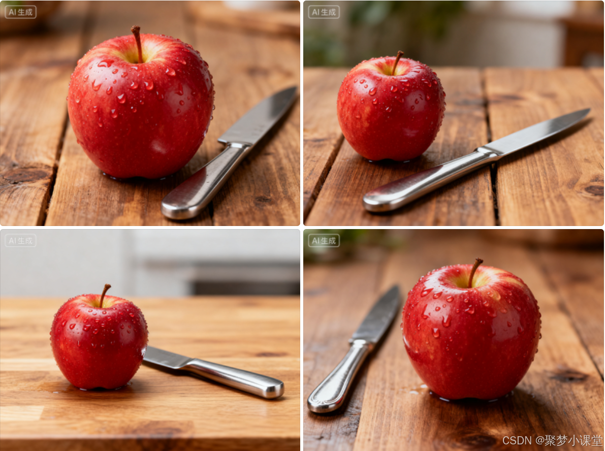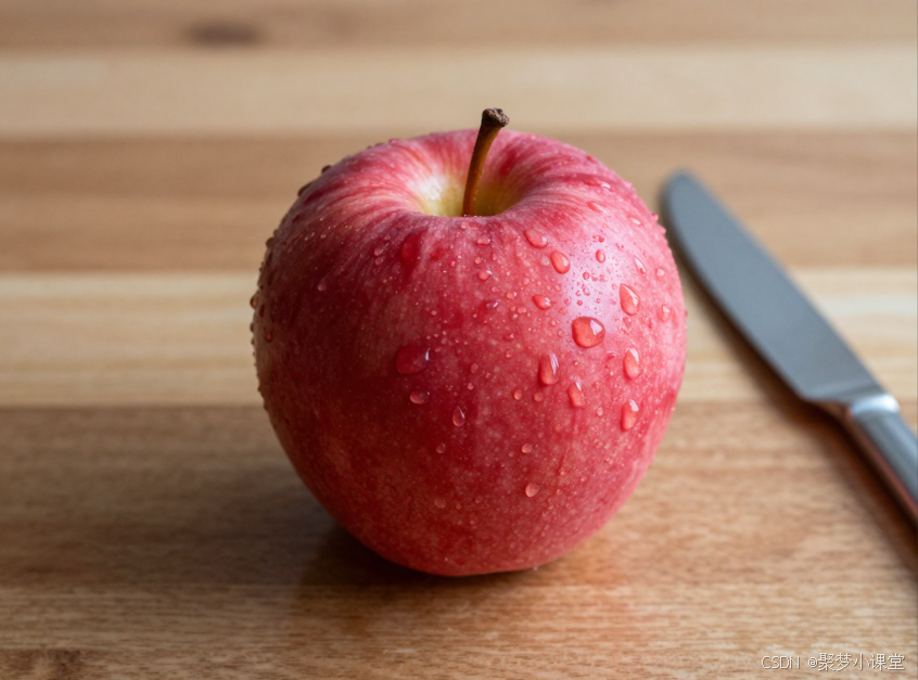 提示词: 一个放在木质桌面上的红苹果,表面有水滴,旁边有一把不锈钢餐刀,背景虚化。摄影级画质。
