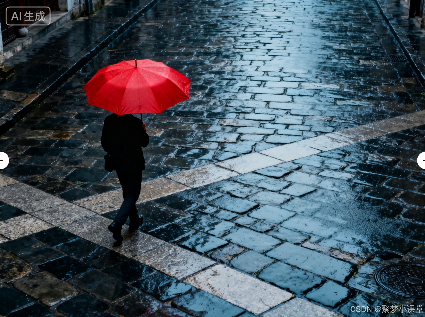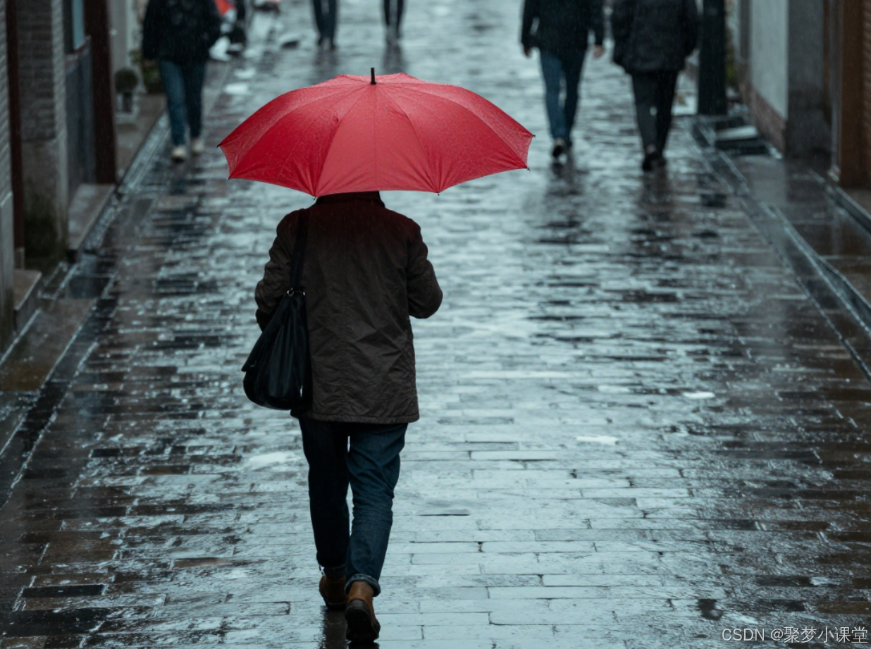 提示词: 一个行人打着一把红伞,走在雨中的青石板街上,采用三分法构图,人物位于左侧交叉点。电影感,色调偏冷。