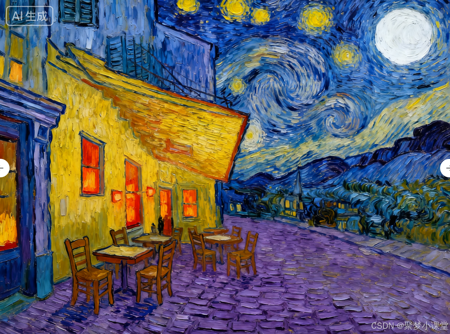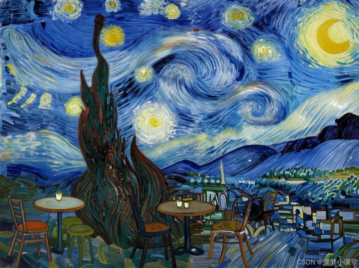 提示词: 一座星空下的咖啡馆,采用文森特·梵高的风格,充满旋涡状的笔触和鲜艳的色彩。