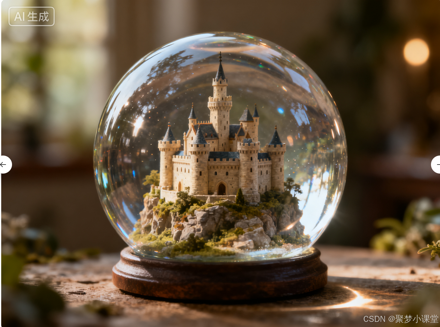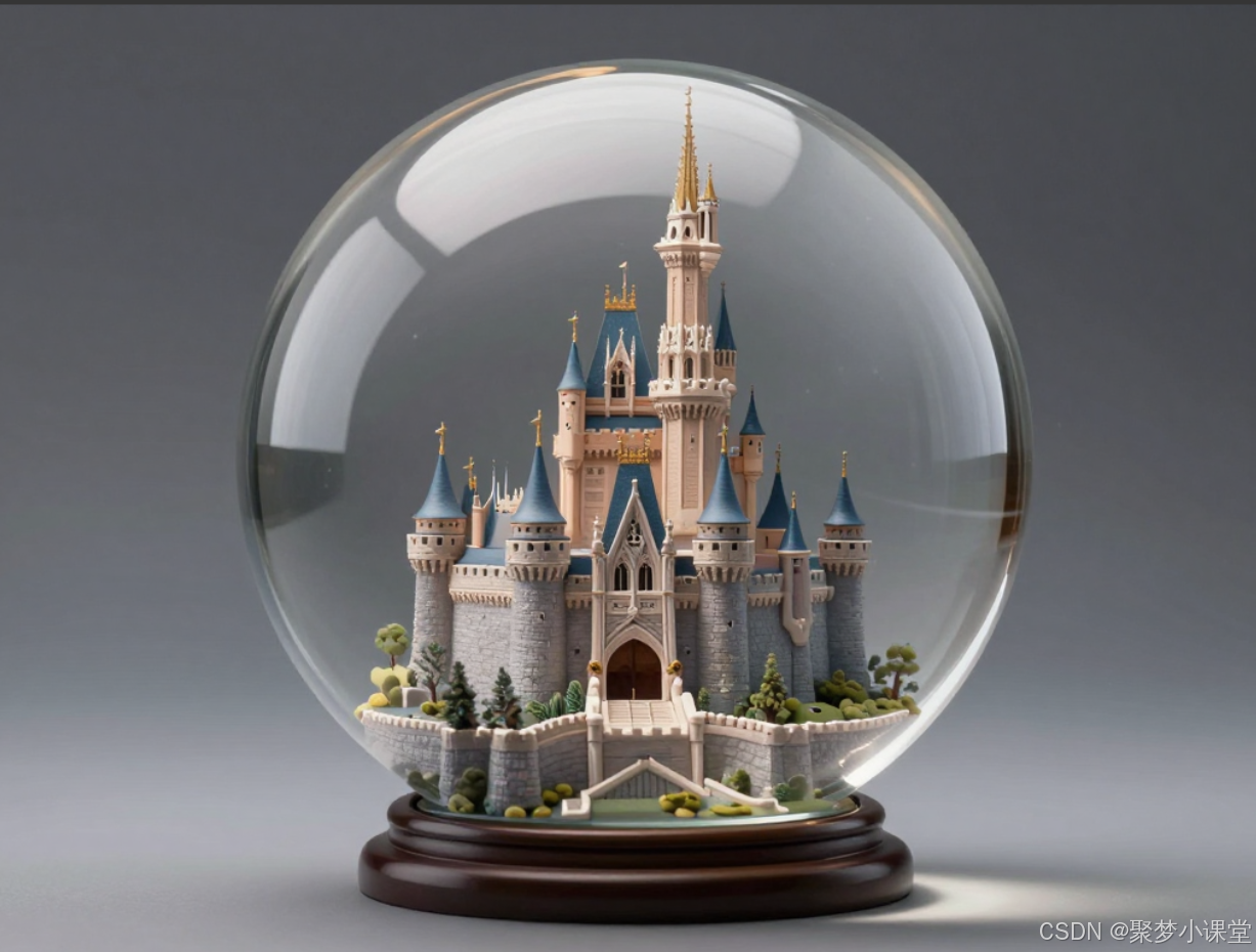 提示词: 一个水晶球,里面有一座微缩城堡,柔和的全局光照,渲染引擎 Cycles,照片级真实感。