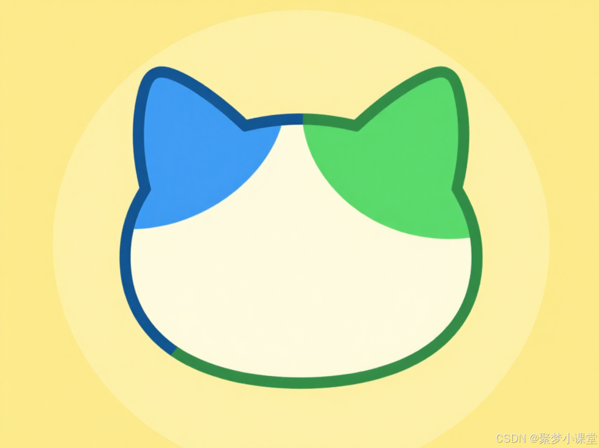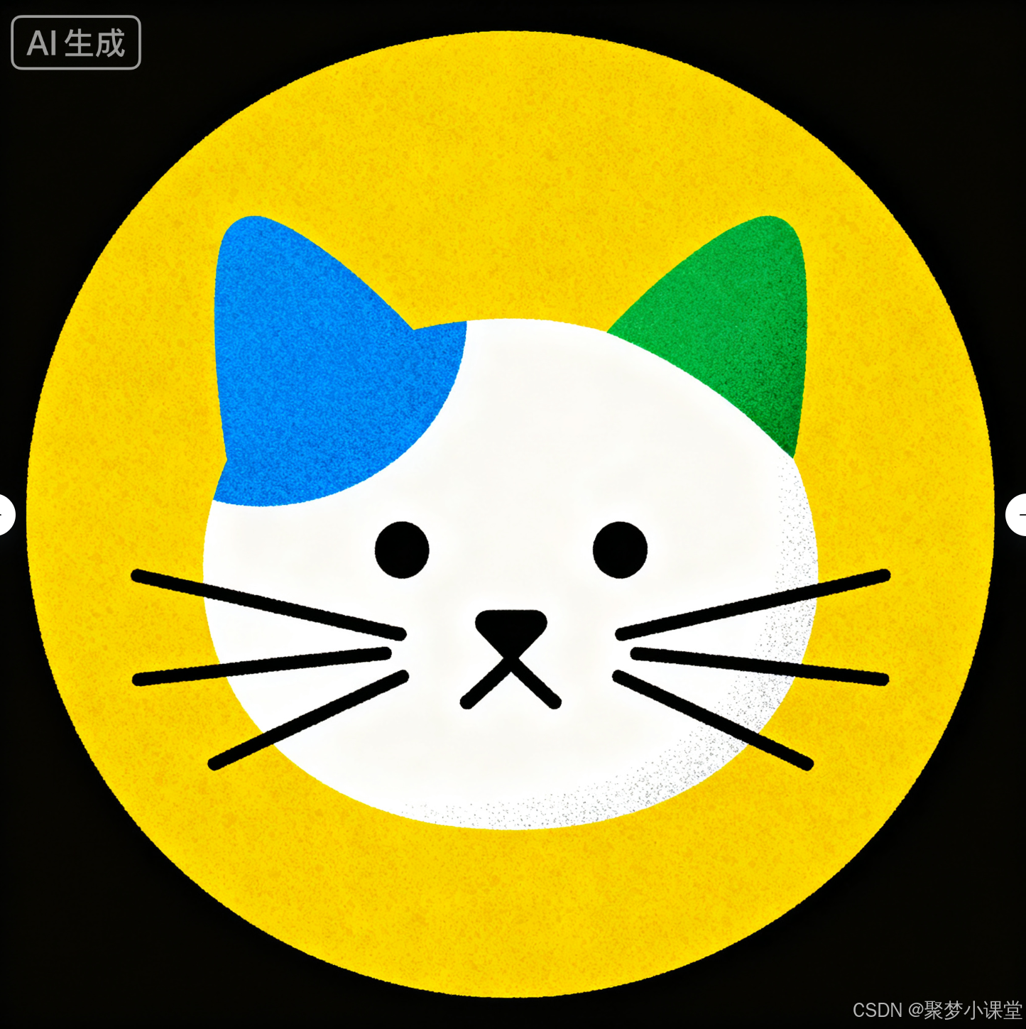 提示词: 生成一个图标,图案是一个简笔画的猫头,猫的左耳是蓝色的,右耳是绿色的,背景是黄色圆形。扁平化设计。