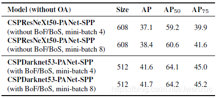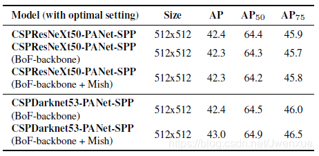 我们可以假设选择的backbone模型具有较大的感受野(具有很多3×3卷积层)和大量的参数。表1显示了CSPResNeXt50,CSPDarknet53和EfficientNet B3的相关信息。CSPResNext50仅包含16个3×3卷积层、425×425感受野大小和20.6M个参数,而CSPDarknet53包含29个3×3卷积、725×725感受野大小和27.6M个参数。这种理论上的证明,加上我们大量的实验表明:CSPDarknet53是这两个神经网络中最佳的检测器backbone模型。