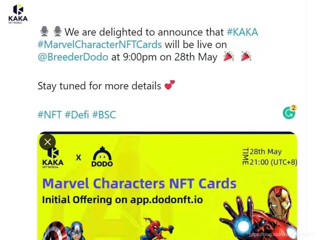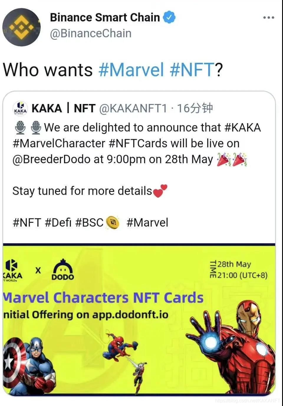据悉,本次是KAKA 漫威典藏版NFT卡牌首次开售,这一消息极大地引起了业界的关注和点赞,其中BSC官方推特转发KAKA推特图片。