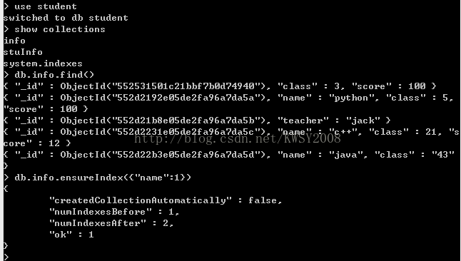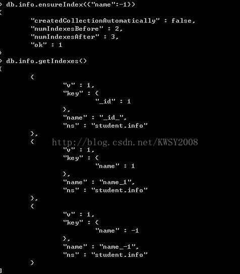 删除索引,要使用dropIndex命令,注意,对一个字段,既可以建升序索引,也可以建降序索引,如上图所示,因此在删除的时候,要指定删除的是哪一个索引