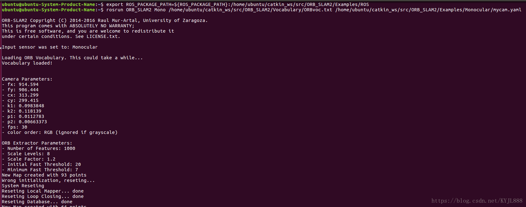 $ rosrun ORB_SLAM2 Mono /home/ubantu/catkin_ws/src/ORB_SLAM2/Vocabulary/ORBvoc.txt
