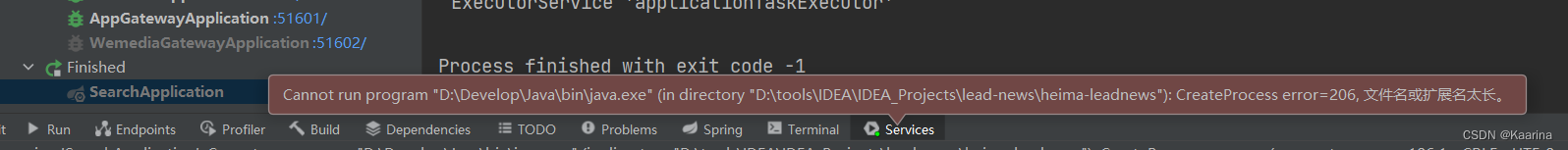 IDEA无法启动,提示文件名或扩展名过长 IDEA模块通过Debug模式启动,提示:Cannot run program "D:\Develop\Java\bin\java.exe" (in directory "D:\tools\IDEA\IDEA_Projects\lead-news\heima-leadnews"): CreateProcess error=206, 文件名或扩展名太长