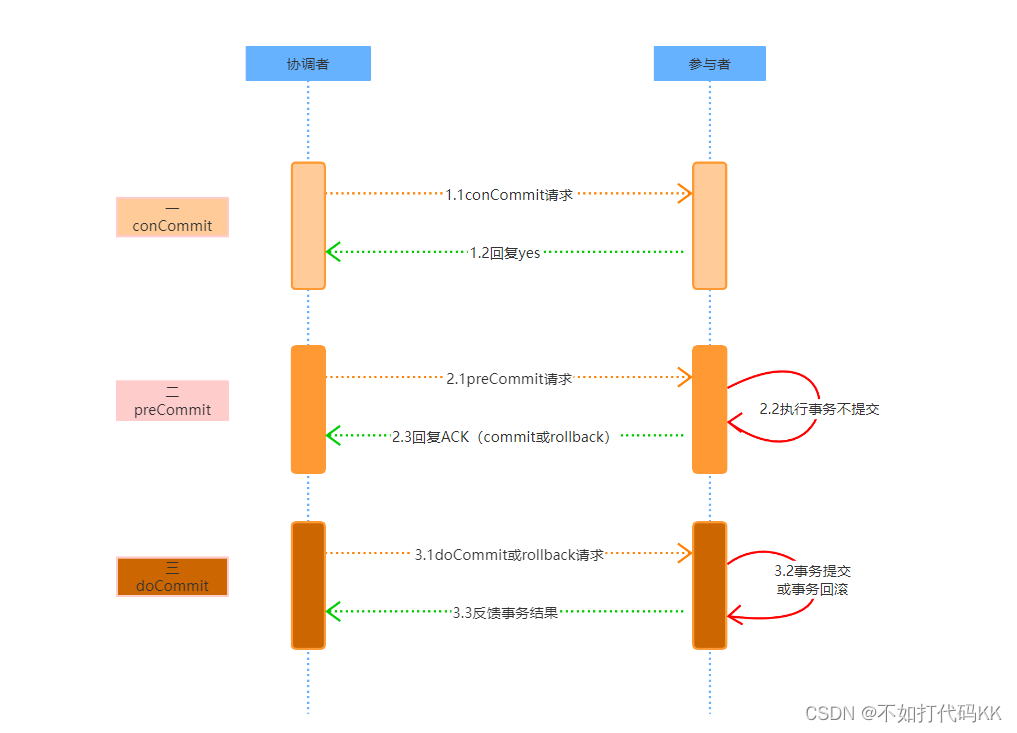 3阶段提交协议(3pc) 三阶段提交协议是一个强一致、中心化的原子提交协议。解决了分布式事务、副本容错等分布式问题。其核心思想是将2PC的二阶段提交协议的“准备阶段”一分为二,形成了由CanCommit、PreCommit、DoCommit三个阶段组成的事务处理协议。协调者向所有的参与者发送一个包含事务内容的CanCommit请求,询问是否可以执行事务提交操作。参与者根据自身的状态判断是否可以执行事务提交,并返回响应给协调者。协调者在接收到所有参与者的CanCommit响应后,进行决策。