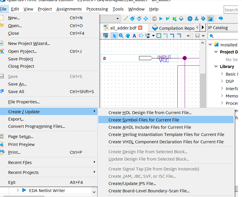 在打开半加器原理图文件half_adder.bdf的情况下,选择菜中File中的Create/Update→CreateSymbolFilesforCurrentFile项,即可将当前文件h_adder.bdf变成一个元件符号存盘,以待在高层次设计中调用。