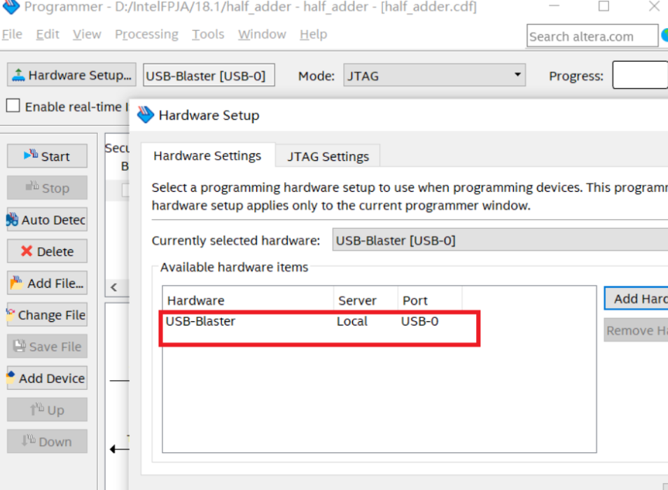 选择好下图中的移动接口,没有这个接口要到在设备管理器中找到加感叹号的USB-blaster设备,并在一下路径下18.1/quatus/drivers/USB-blaster添加驱动。