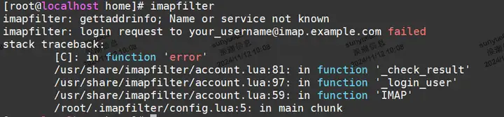 执行imapfilter启动imapfilter(本次测试为离线服务器,无法连接邮箱,外网机器配置上正确的邮箱信息可正常启动imapfilter)