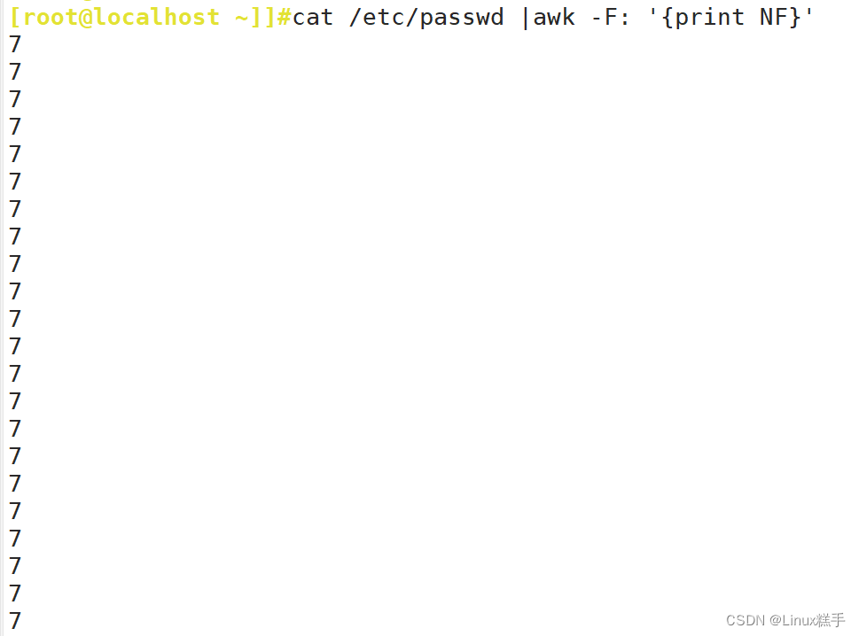 cat /etc/passwd |awk -F: '{print $(NF-1)}'