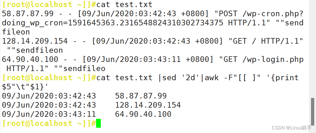 3.将某日志文件访问用户的IP地址,在第三列冒号隔开,统计出访问量前十的IP地址