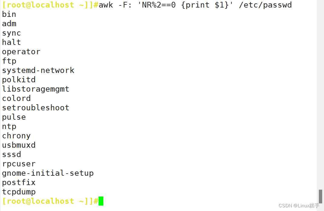awk -F: 'NR%2==0 {print $1}' /etc/passwd