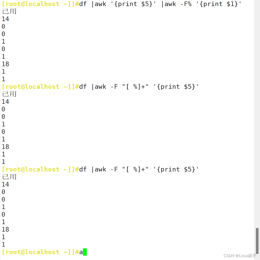 df|awk '{print $5}'|awk -F% '{print $1}'