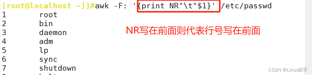 awk -F: '{print NR"\t"$1}' /etc/passwd