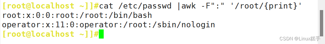 cat /etc/passwd |awk -F":" '/^root/{print}'