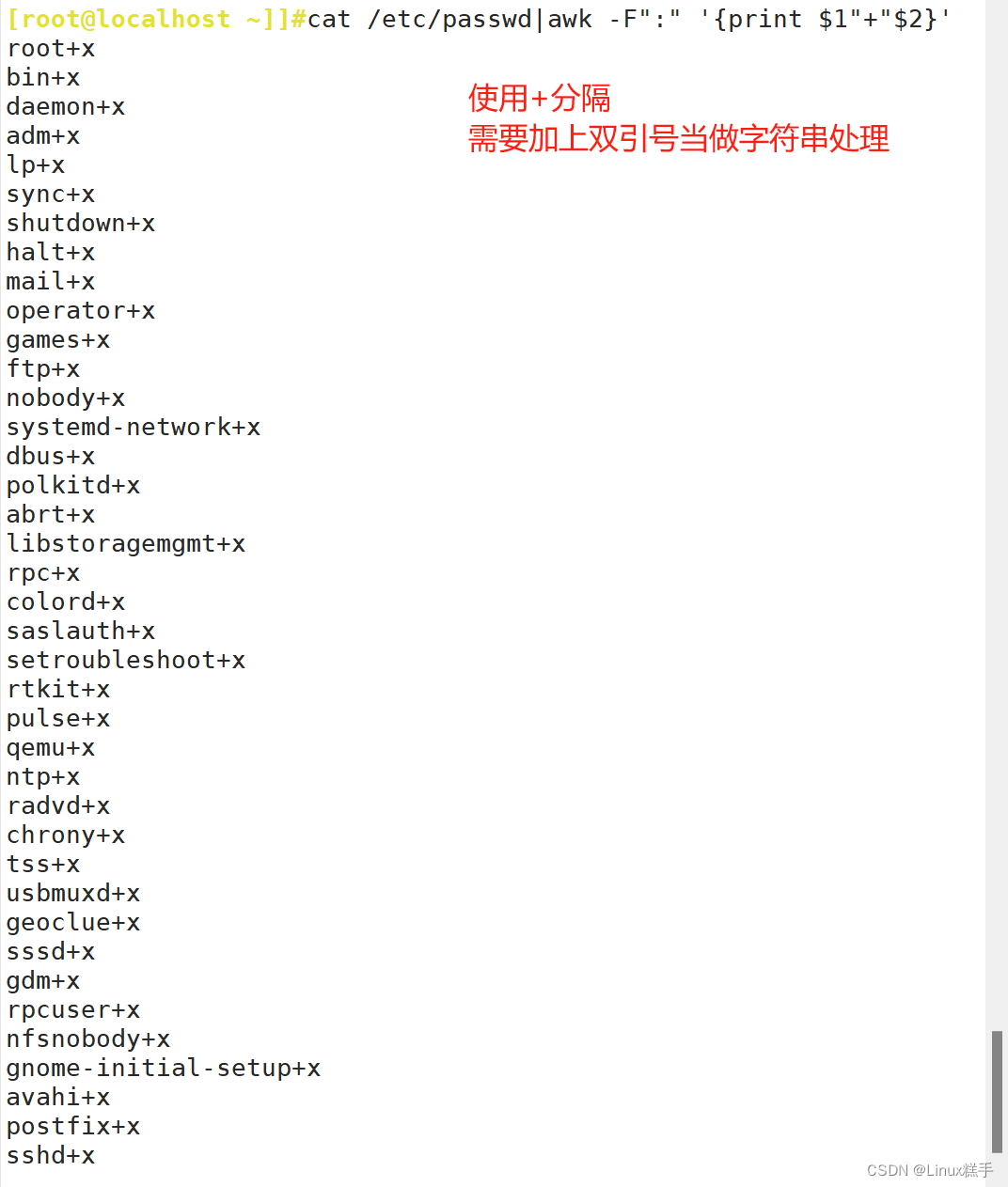 cat /etc/passwd|awk -F":" '{print $1"+"$2}'