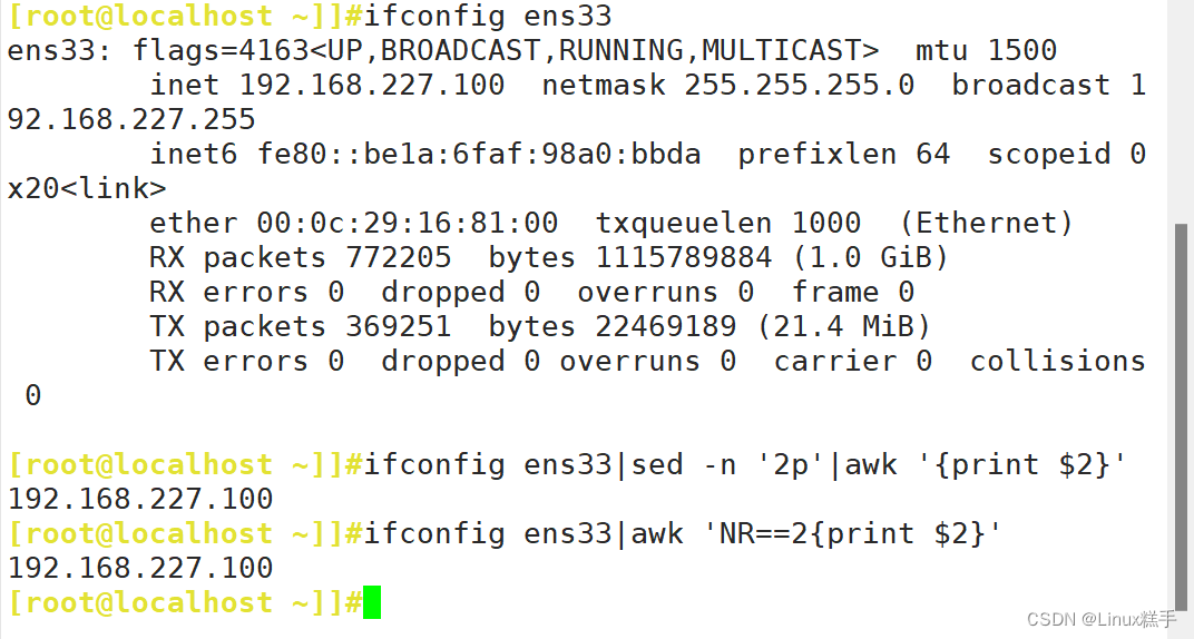 ifconfig ens33|sed -n '2p'|awk '{print $2}'