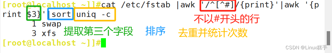 1.统计/etc/fstab文件中每个文件系统类型出现的次数