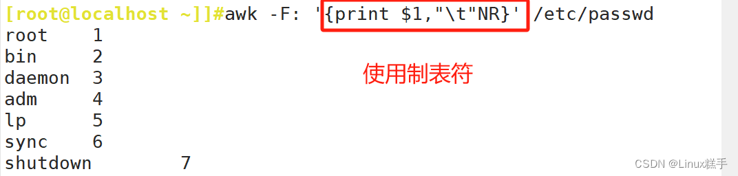awk -F: '{print $1"\t"NR}' /etc/passwd