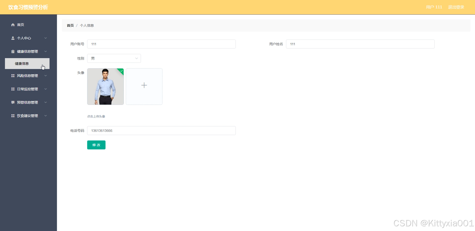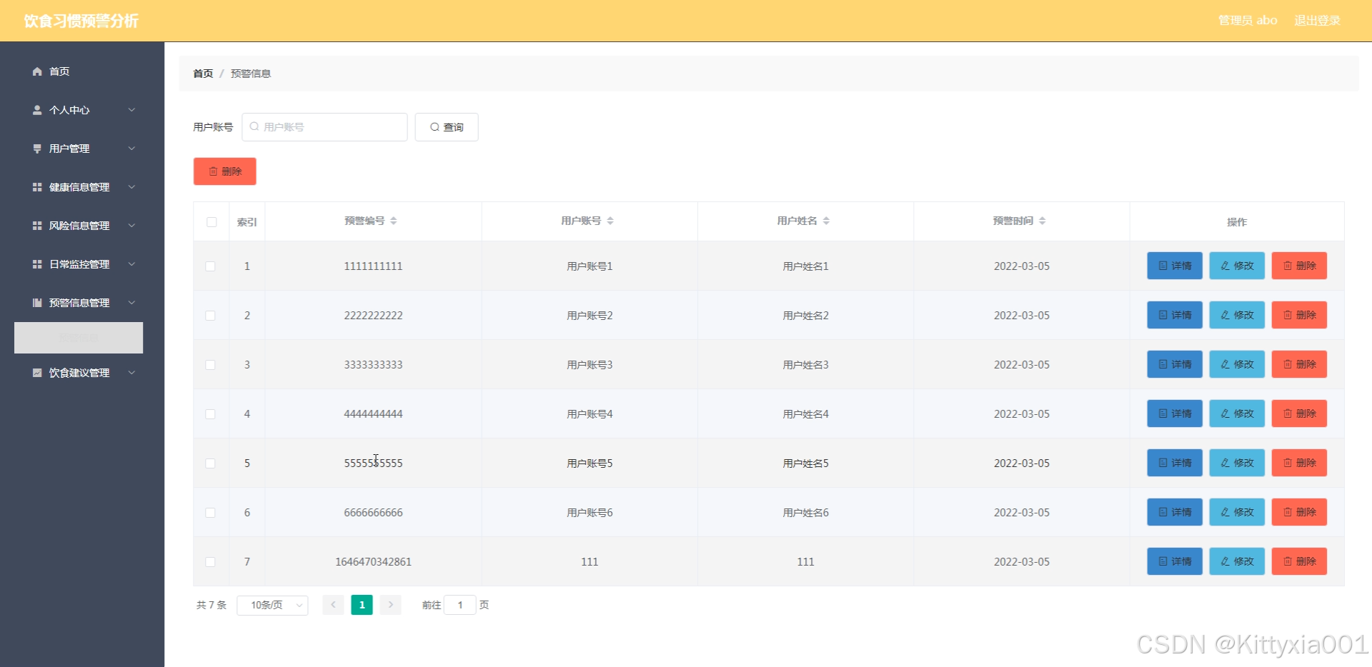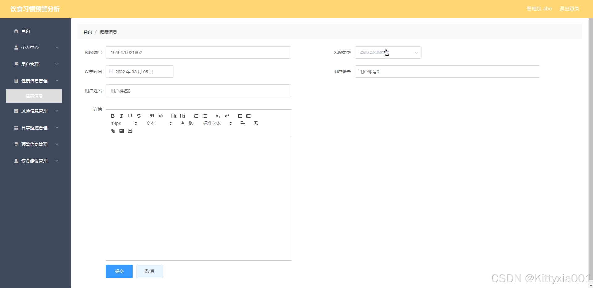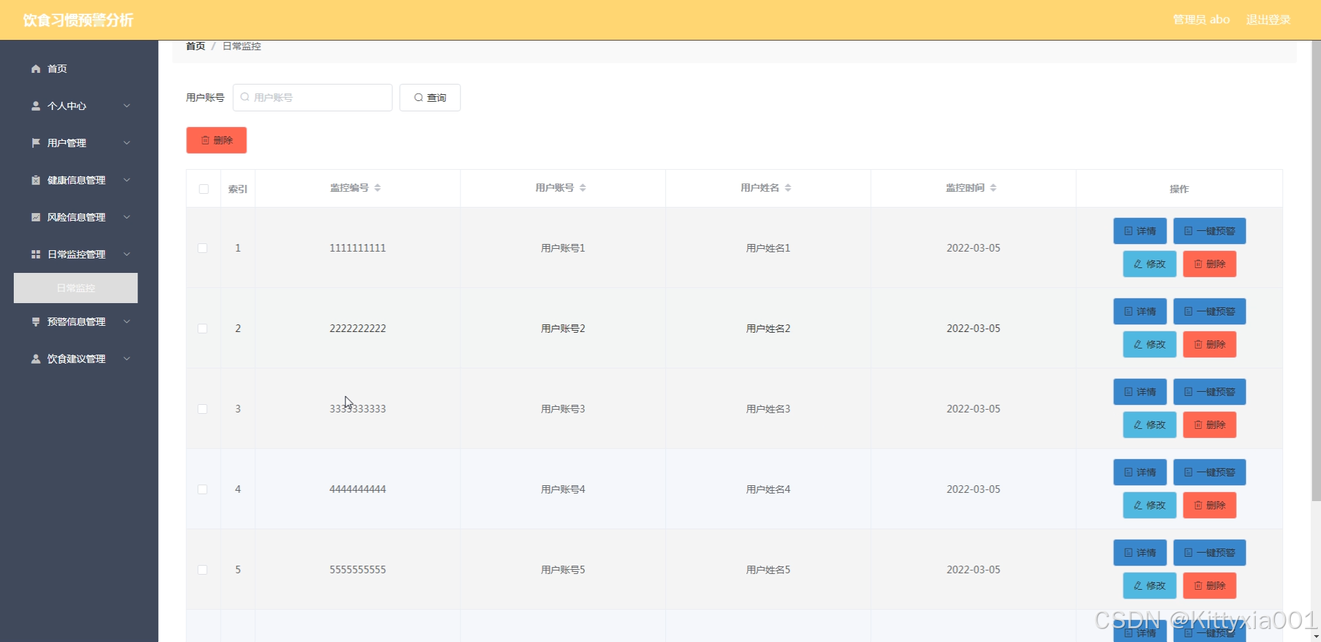 - 设计并实现一个饮食习惯预警分析系统,包括用户信息模块、健康信息分析模块、风险信息识别模块、日常监控模块、预警信息发布模块和饮食建议提供模块。