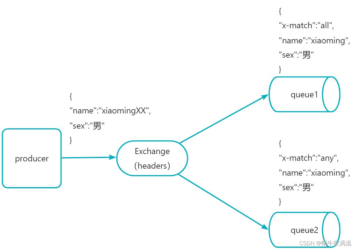 虽然queue1和queue的map中要求的参数信息基本一致,但匹配规则不同,queue1是“x-match:all” ,即需要完全匹配,而后者是“x-match:any”,即只要一个满足就可发送到,从图中可以看到queue2里 " "sex":男" "可以匹配到的。