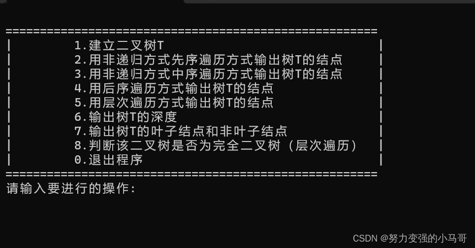 C语言数据结构 二叉树的各种操作 设树结点的元素类型为char,实现以下二叉树的各种基本操作的程序:② 建立不少于10个结点的二叉树T; ② 用非递归方式先序遍历方式输出树T的结点; ③ 用非递归方式中序遍历方式输出树T的结点; ④ 用后序遍历方式输出树T的结点; ⑤ 用层次遍历方式输出树T的结点; ⑥ 输出树T的深度; ⑦ 输出树T的叶子结点和非叶子结点;⑧ 判断该二叉树是否为完全二叉树(层次遍历); ⑨ 主函数通过函数调用实现以上各项操作。