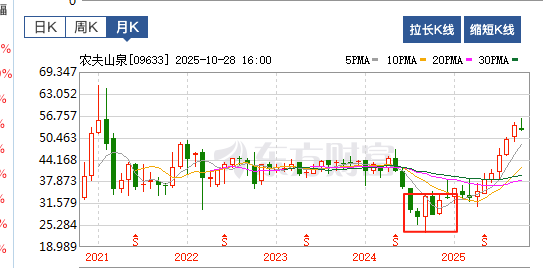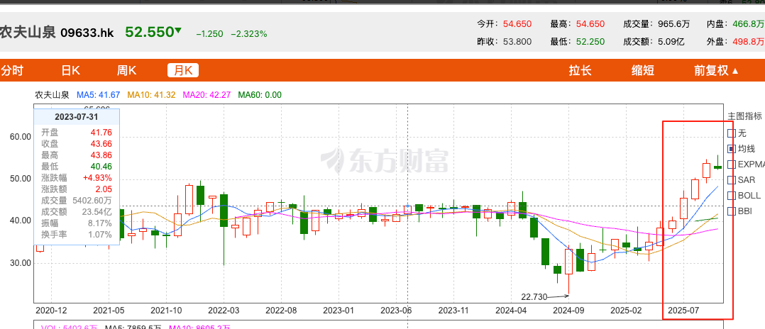 2025年上半年业绩报告市场迅速用股价表达了新的判断:根据人民报报道,到2025年7月,农夫山泉股价创出约42个月新高,公司市值重新站上5200亿港元以上。