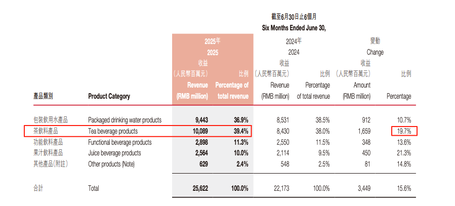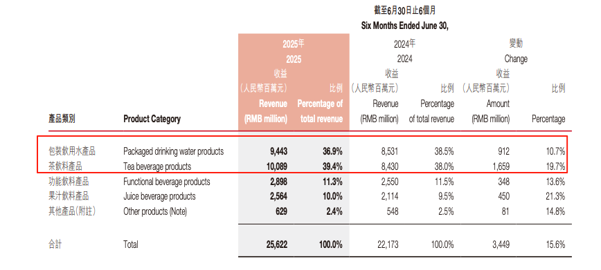 最大的亮点来自于业务结构的优化。2025年上半年,茶饮料业务收入首次突破百亿大关,达到100.89亿元,同比增长19.7%,占总收益的比重上升至39.4%,正式取代包装水,成为公司第一大收入来源。这主要归功于旗下“东方树叶”和“茶π”两大单品的持续热销,尤其是在无糖茶饮市场的绝对领先地位。而包装饮用水业务也走出了低谷,实现收入94.43亿元,同比增长10.7%,基本盘依然稳固。