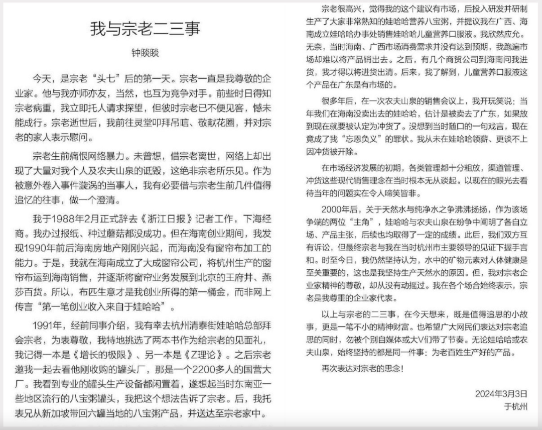钟睒睒在微博和公号发出长文《我与宗老二三事》,亲自下场回应。这在大型消费企业里并不常见:绝大多数品牌会通过“品牌声明”“律师函”维稳,他却以个人身份发声,继续把“企业=人”的叙事牢牢绑紧。可以看到,他的“雷人语录”并非简单的情绪释放,更像是一种品牌自我保护手段,甚至是定价权的防御武器。