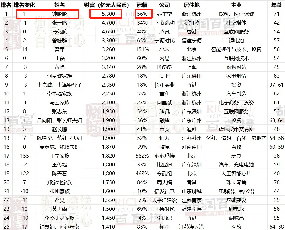 换句话说,2025年的中国首富,不是掌握“下一代算力”的AI大佬,而是一位深耕饮用水、功能饮料、茶饮,以及疫苗与生物健康的企业家。