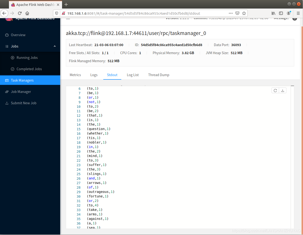 WordCount 被提交到了其中一个 TaskManager 上执行,单词统计结果已经输出到了控制台: