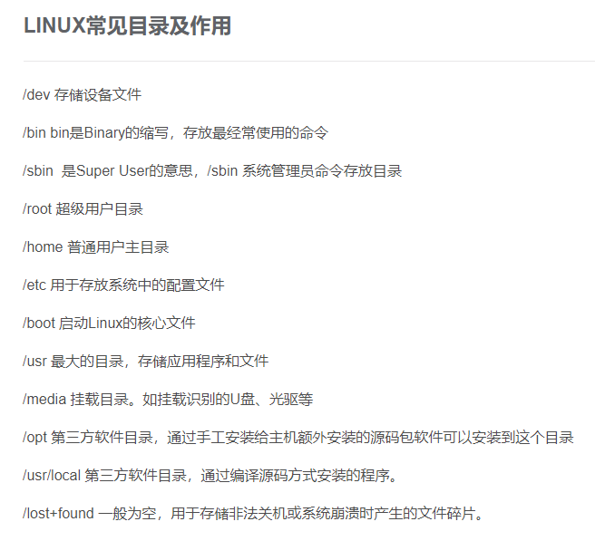 LINUX常见目录及作用 /dev 存储设备文件/bin 存放最经常使用的命令/sbin 系统管理员命令存放目录/root 超级用户目录/home 普通用户主目录/etc 用于存放系统中的配置文件/boot 启动Linux的核心文件/usr 最大的目录,存储应用程序和文件/media 挂载目录。如挂载识别的U盘、光驱等/opt 第三方软件目录,用于安装附加安装包,或者给主机安装新软件/usr/local 第三方软件目录,通过编译源码方式安装的程序。/lost+found 一般为空,用于存储
