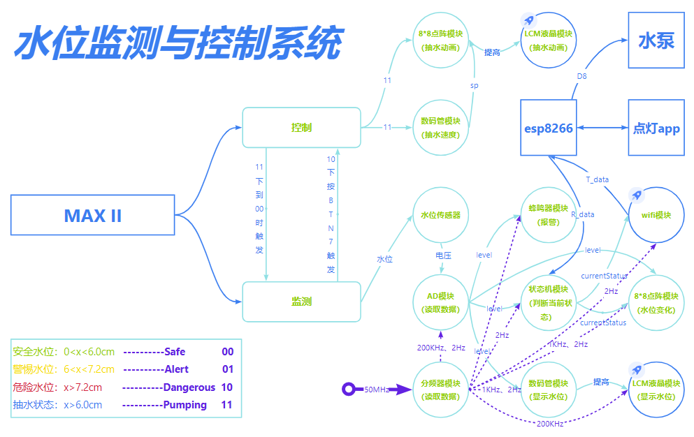 本文详细介绍了基于VHDL和Arduino实现的一个智能水位监测与控制系统,主要功能涵盖水位感知和控制水泵自动排水两大部分。系统根据水位传感器采集数据,通过ADC(模拟到数字转换)模块处理信号后将其分类显示(正常-谨慎-危险)。系统利用LED数码管、点阵显示器、以及LMD显示屏直观展示水位,采用蜂鸣器预警,且支持Wi-Fi远程控制。具体实施过程中,通过多个子程序模块(如:ADC采集模块、分频器模块、状态控制模块、显示模块、WiFi模块等),解决了实际操作过程中的一系列问题,比如传感器精度限制、VHDL浮点运