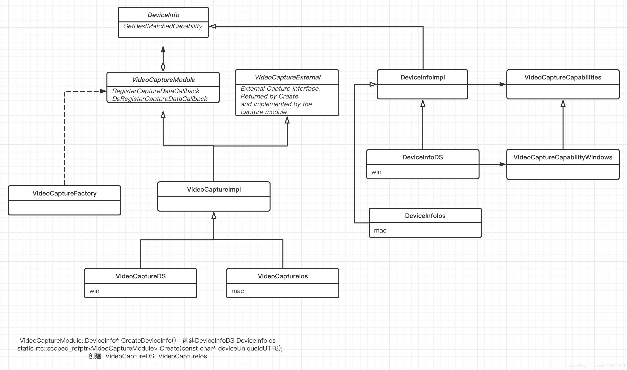 VideoCaptureImpl类是VideoCaptureModule的实现子类,它实现父类定义的通用平台无关接口。对于平台相关接口,则留在平台相关的子类中实现。该类定义一系列工厂方法来创建平台相关的具体子类。不同平台上实现的子类负责在各自平台下实现平台相关功能,主要是开始/结束视频采集和视频数据导出。在Linux平台上实现的子类是VideoCaptureV4L2,在IOS平台的实现为VideoCaptureIos,在Windows平台上的实现为VideoCaptureMF和VideoCaptureDS,等等。