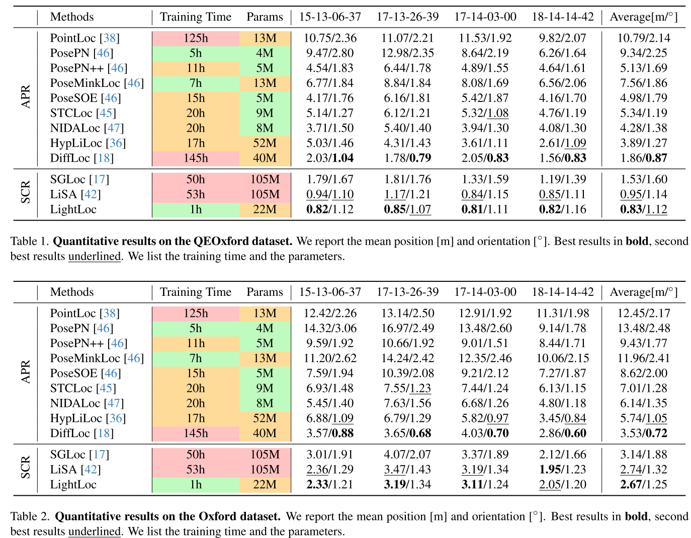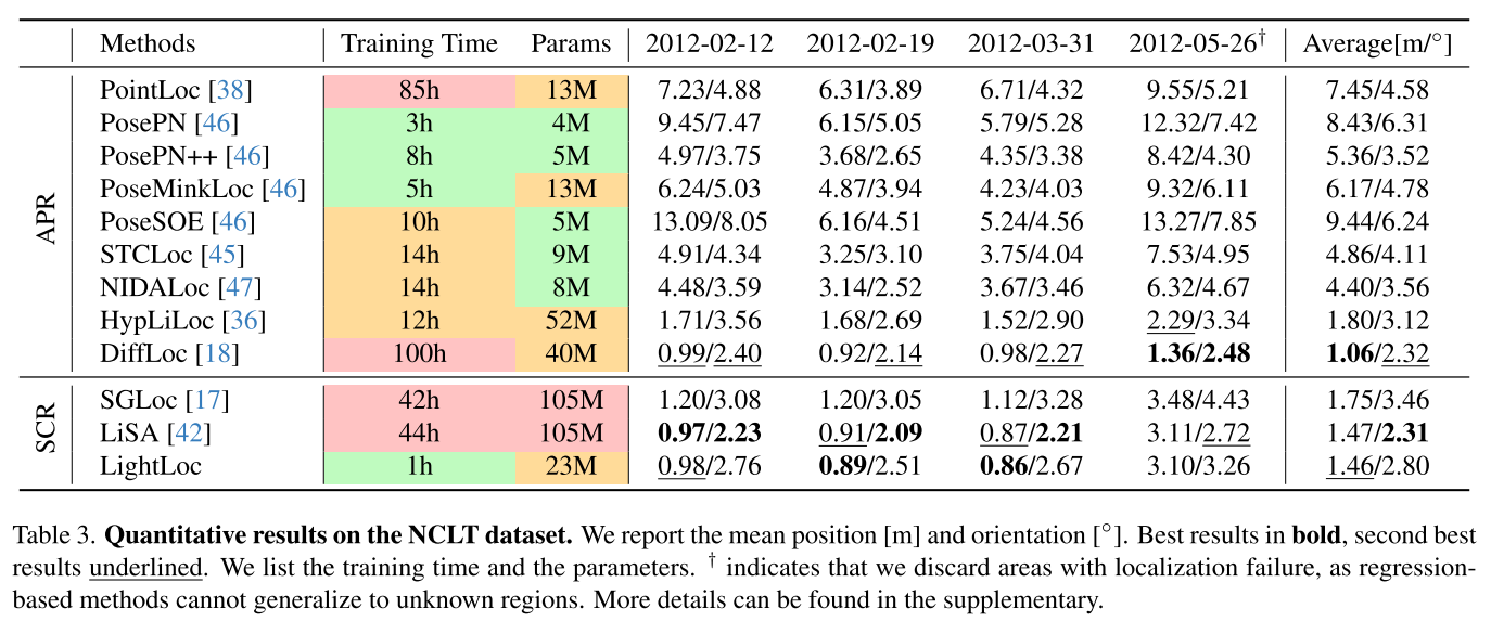 - 相比DiffLoc:训练时间快145倍,位置精度提高55.4%,且只需单帧输入