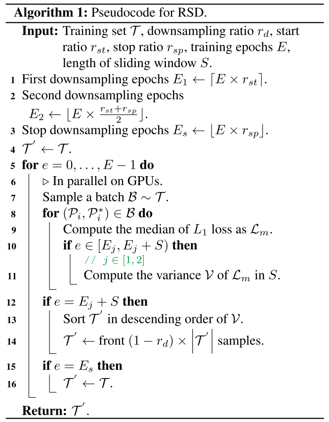- 在epoch E1+S时,按V降序排序,保留前(1-rd)×|T|个样本