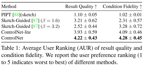 用户研究:在与PITI、Sketch-Guided Diffusion等方法的对比中,ControlNet在结果质量和条件保真度上都获得了最高的用户偏好评分(平均排名4.22/5和4.28/5)。