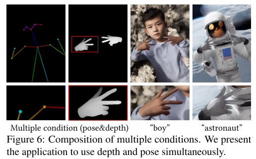 ControlNet支持同时使用多个条件(如边缘+姿势、深度+姿势等)。方法非常简单:直接将多个ControlNet的输出相加到Stable Diffusion模型中,无需额外的权重或插值。