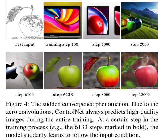 突然收敛现象:由于零卷积的保护,模型在整个训练过程中都能生成高质量图像。作者观察到一个有趣的现象:模型不是逐渐学习控制条件,而是在训练到某一步(通常少于10K步)时"突然"学会遵循输入条件。